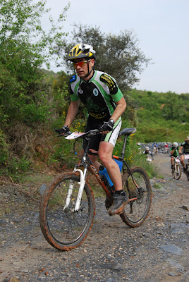 Empiezo a subir, y voy pasando a gente, me digo, no es normal que pase a tanta gente, estoy muy atrás, no tenía referencias de tiempos, no las cogí por si venían mal dadas y me hundía, así que me pongo aún más de mala hostia y si ya pasaba del pulsómetro, ahora cago pa´él, paso a muchísima gente, 200 fácil, a mí me pasarían 3 ó 4 personas, yo a mi ritmo, casi arriba un tío que había parado se me pone al lado, me suena, me pregunta por Viña y luego por Mario (al que aún creía detrás), me doy cuenta de que es un Diañu de los colegas de Mario de Gijón, es Tito, con el que haría casi el resto de la aventura, pero yo a ritmo y él a tirones, voy sobradísimo, vamos charlando. Bajada fácil, aguanto a Tito hasta que abajo del todo en la carretera que lleva a Bárcena veo a Marlén que me abastece de agua (la pobre vino sola a verme, pierdo otros 3 minutos, pero había que parar) bueno así ya no hecho líquido en el avituallamiento que es inminente, pero de repente cuando estoy repostando me dice "Mario te saca 15 minutos"....................¿cómo?........me lo repite y no doy crédito........joder con el que iba a salir atrás!!!!, mecagoenlaput.........., me piro arreando al avituallamiento, el cual fue el único q hice bien, como rápido y cargo plátanos para la subida, a todo esto llevaba barritas partidas en trozos en el maillot, las cuales fui comiendo gran parte de esta historia.